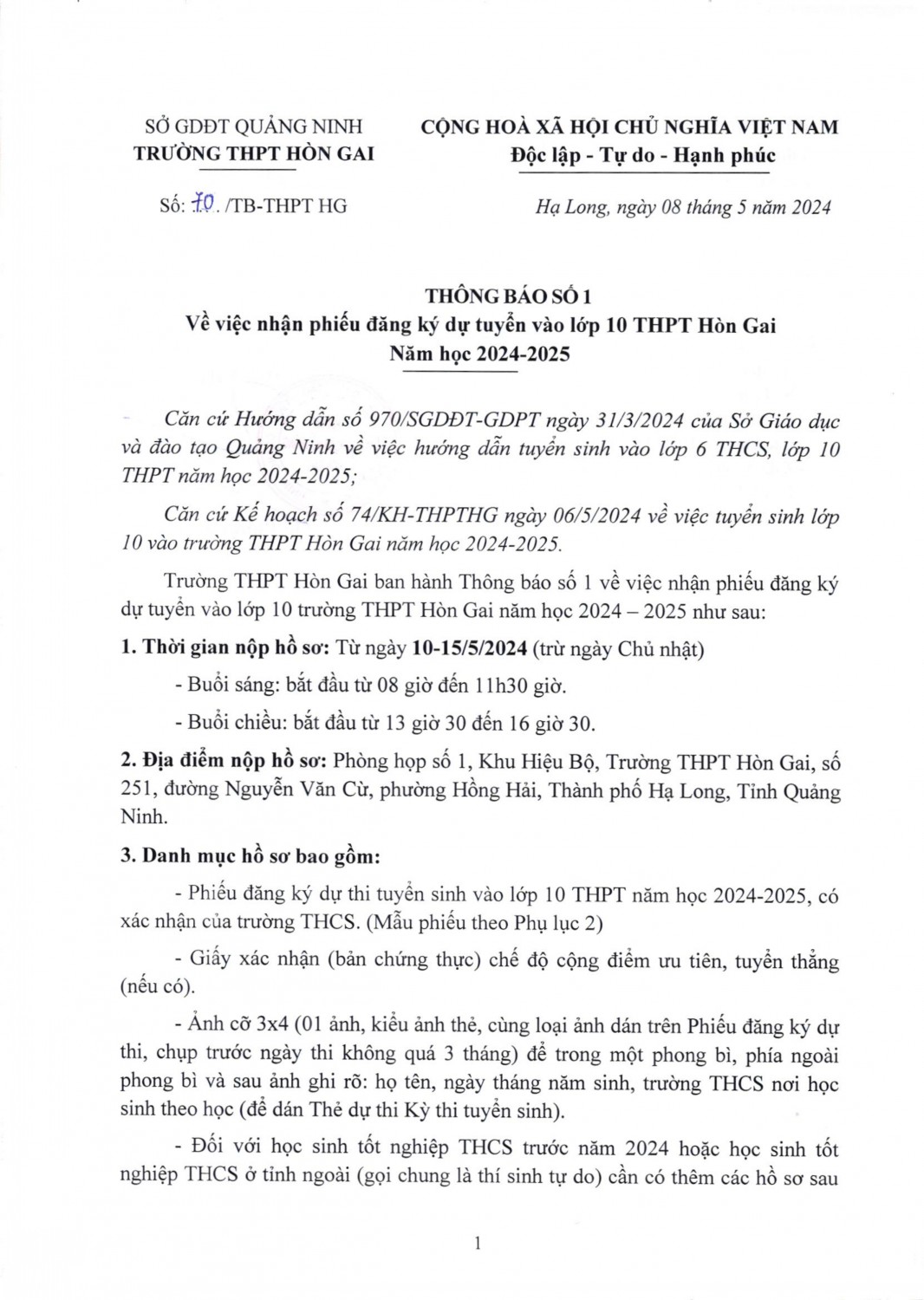 Thông báo số 1 về tuyển sinh 10 tại trường THPT Hòn Gai năm học 2021 - 2022